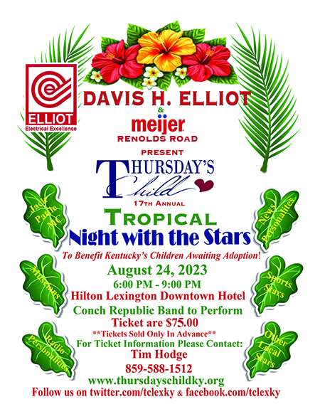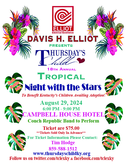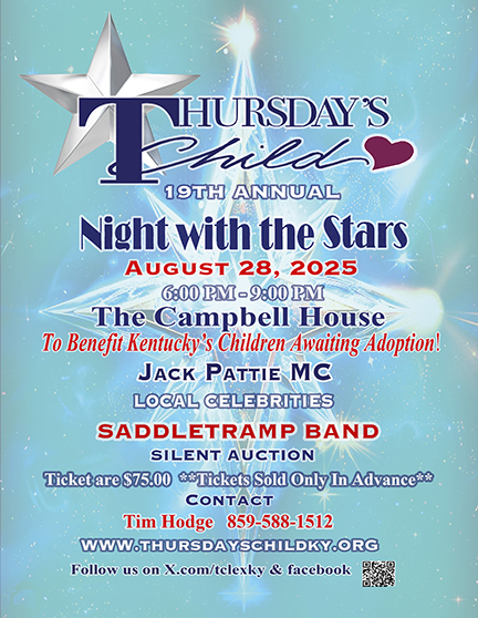 Thursday’s Child Inc., a non-profit board, was established in 1989 to support the children and families that are served by the Kentucky Adoption Profile Exchange (KAPE) originally Special Needs Adoption Program (SNAP). In addition to recruitment activities for over 300 Kentucky children awaiting adoption, Thursday’s Child, Inc. assists with funding activities that would not be covered elsewhere. Your sponsorship of Thursday’s Child “A Night with the Stars will allow Thursday’s Child to continue to support the following activities that promote permanence for these waiting children: picnics and other matching events for waiting children and prospective families, special interest camps, educational grants for children exiting foster care, school and community activities for the waiting children that state monies will not fund, child care for adoption support group meetings and workshops to support the families for families who adopt these children.